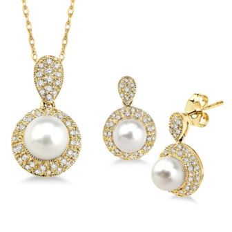 The merging of diamonds and pearls says, "This lady defines class". Stunning .60twt diamond & pearl set, 6mm cultured pearls, 14k yellow gold, 18" cable chain. Matches well with ring JR550-Y.