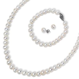 A gorgeous collection with lustrous white 7-8mm freshwater pearls, sterling silver filigree clasps and posts. The sophisticated set includes earrings, 7" bracelet and an 18" strand.
