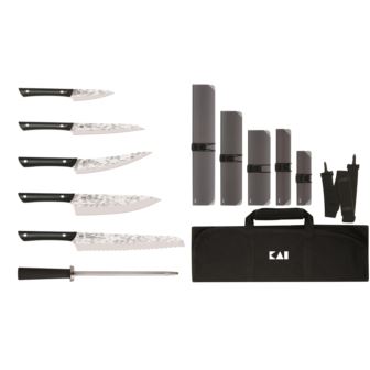 Includes 3.5" pairing, 6" utility, 8" chef's 6.5" Boning/Fillet, 9" Bread knives. Imported Japanese AUS6M corrosion-resistant stainless steel blades, NSF Certified. Full-tang construction and a riveted POM handle will provide a lifetime of pro-level performance. Double bevel cutting angle 16 degrees each side. Includes blade guards for extra protection and an 8-slot Kai knife roll. Striking, hammered blade finish not only look good, but are functional. Shun is hottest selling gourmet knife brand in the country.