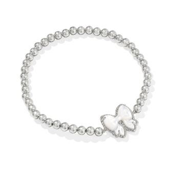 The perfect present to yourself (or a pal!), the Haley Silver Bow Stretch Bracelet adds texture and charm to any wrist stack. Shining beads combine with a custom-carved mother-of-pearl bow on a stretch bracelet style to help you top off your look. Pair with other pieces from the Haley Bow suite to tie any look together. 6.5" Unstretched Circumference. 0.72"L X 0.55"W Station. Metal: Rhodium Over Brass. Material: Ivory Mother-of-Pearl.