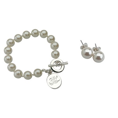 Timeless, traditional and once again trendy the Lauren Ralph Lauren 10mm simulated pearl bracelet and earring set will please all women. The bracelet measures 7" and features a silver toggle closure with signature RLL fob. The set is completed with matching 10mm pearl studs. Gift packaging is available.