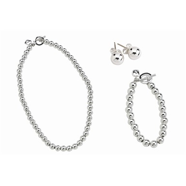 Essential to every woman's jewelry collection the Lauren Ralph Lauren 8mm silver bead necklace, bracelet and stud earrings. The necklace measures 16" and the bracelet 7". Both feature a silver toggle closure and signature RLL fob. The trio is completed with matching 8mm silver studs. All items have an anti-tarnish coating. Gift packaging is available.