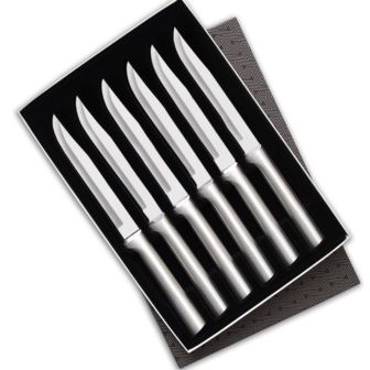 This Six Utility/Steak Knives Gift Set turns six of our superb knives into a hard-working, sharp-looking gift that will be appreciated by anyone! These indispensable kitchen knives have a 4?" blade that cuts through virtually any food. The perfectly sized handle guarantees a good grip and the finger guard protects fingers while cutting. The blades are made of surgical-grade T420 high-carbon stainless steel for a blade that retains its edge and remains incredibly sharp. Limited Lifetime Guarantee. Made in the USA.