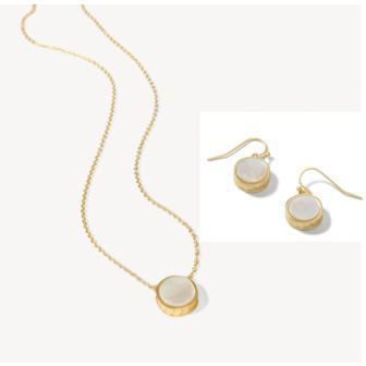 Named after a mermaid in long lost folklore, Naia means “to flow," which suits this mother-of-pearl earring and necklace collection beautifully. Spartina created these thickset shimmering droplets in homage to the powerful, swirling curves of a mermaid's tail. Look for the ring of Naia's mermaid scales on each piece! Both pieces are 18KT matte gold plated. Necklace has lobster clasp and measures 16" plus has a 2.5" extender. Earrings are pierced with 0.8" drop.