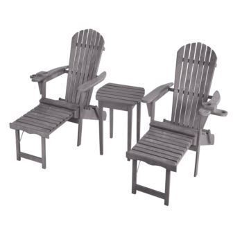 The Oceanic Adirondack Chaise Lounge is a staple of any patio. Constructed of beautiful pine wood that resists moisture and cracking, this lounge features a reclined back, oversized arms, and a gently sloping seat. This chair is also equipped with an interchangable cup and wine glass holder to suit your needs. Pull out the built-in ottoman and experience a new level of relaxation as you read a book or absorb the sun. This chaise lounge can easily be folded to save storage space and to transport it effortlessly. Includes 2 Chaise Lounges & 1 End Table.