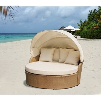 Kick back and relax on the outdoor leisure bed built with a patented hydraulic slow closing retracting canopy, seat cushion and four matching throw pillows. Built with world leading VIRO rattan wicker that resists fading in the sun. Outdoor grade spun polyester fabric is the best outdoor grade fabric and is designed for any weather conditions. Quick dry cushion material wicks away moisture to eliminate mildew.
