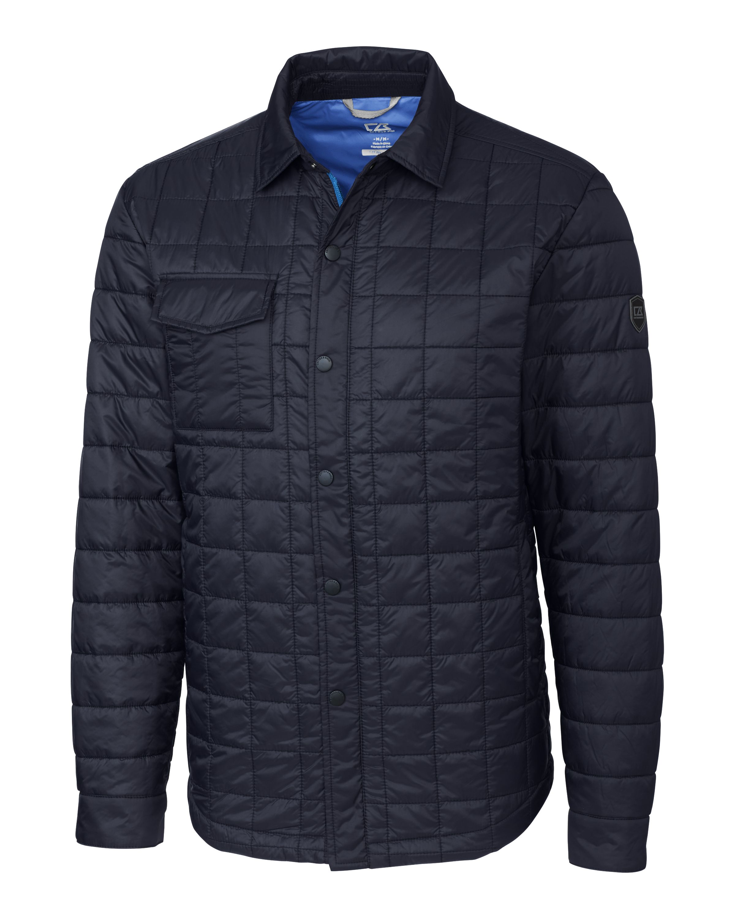 The iconic and sustainable Cutter & Buck Rainier Recycled Insulated Puffer Mens Full Zip Shirt Jacket is engineered from lightweight, recycled, down-alternative insulation for exeptional four season versatility, designed to be your favorite quilted mens eco-friendly quilted shirt jacket for the office, WFH, walking, and dashing around town. The Rainier's Primaloft® Silver insulation is crafted from 70% recycled polyester, keeping you warm so you can stay outside year roung and make a difference for the planet.