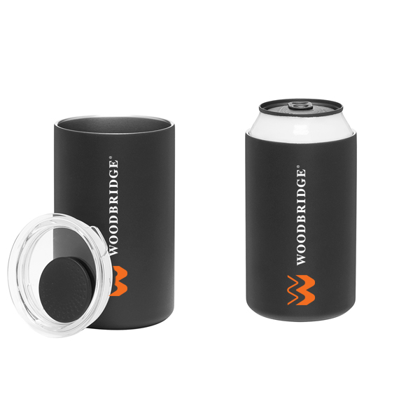 11 oz double wall 18/8 stainless steel multi-use thermal tumbler or can cooler with copper vacuum insulation, push-on lid, matching swivel closure, and powder coated finish [fits standard cans] · patent pending · gift box included. Features our brand.