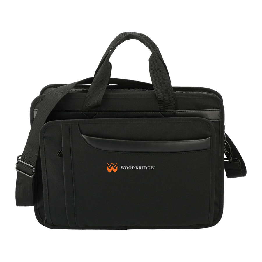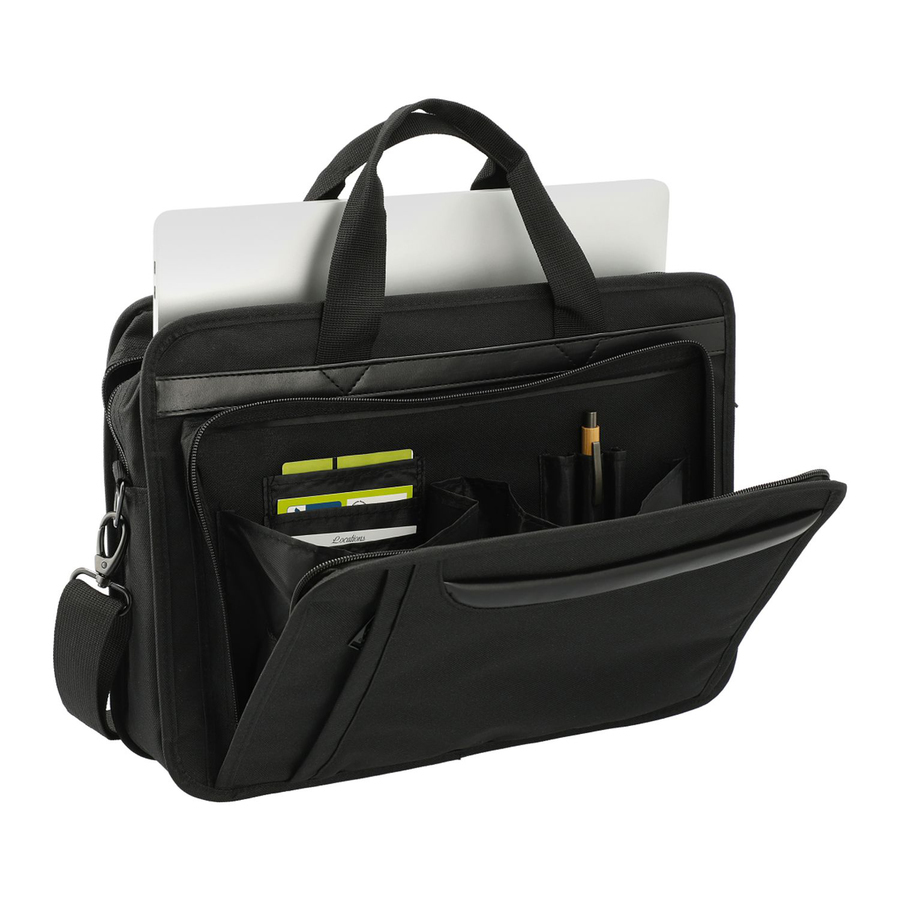 Use the Paragon 15" Computer Briefcase to organize, carry, and store daily essentials. It features a padded computer compartment that fits most laptops up to 15", plus a full front organizer and file dividers for documents or small accessories. This PolyCanvas briefcase has a removable, adjustable shoulder strap for easy handling and transportation. Featuring our brand!