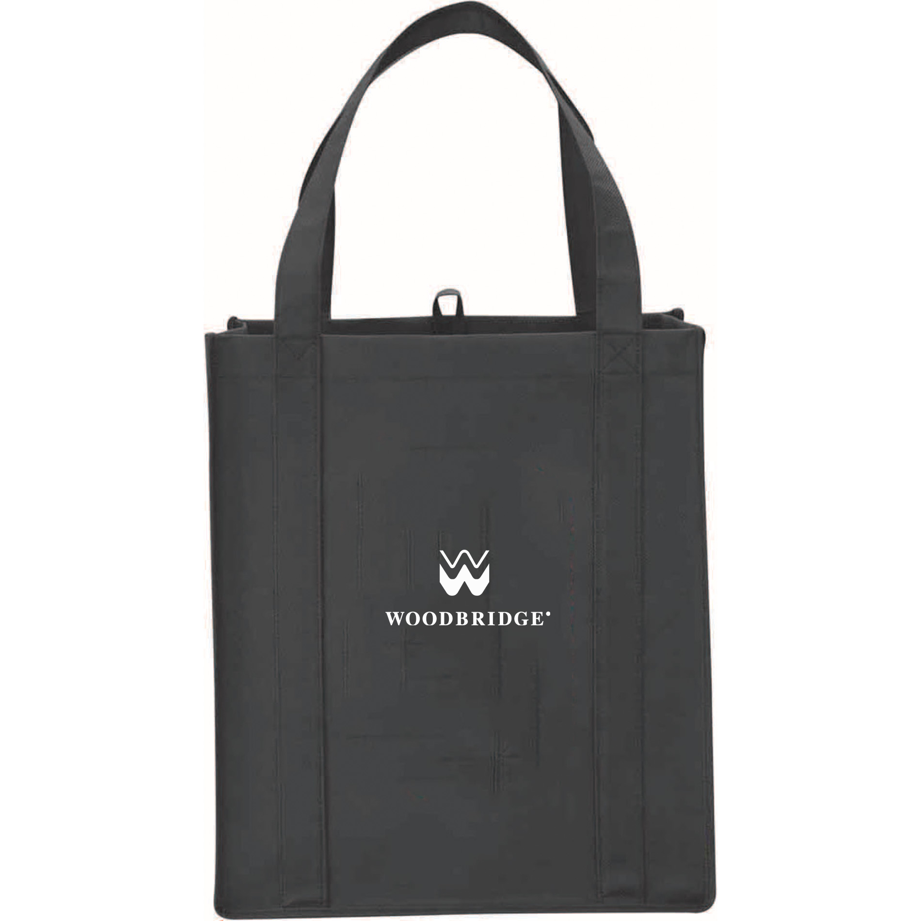 Non-woven polypropelene shopping tote features board for base of bag to make this stand and neatly hold its contents. Recyclable tote with 24" matching handles.