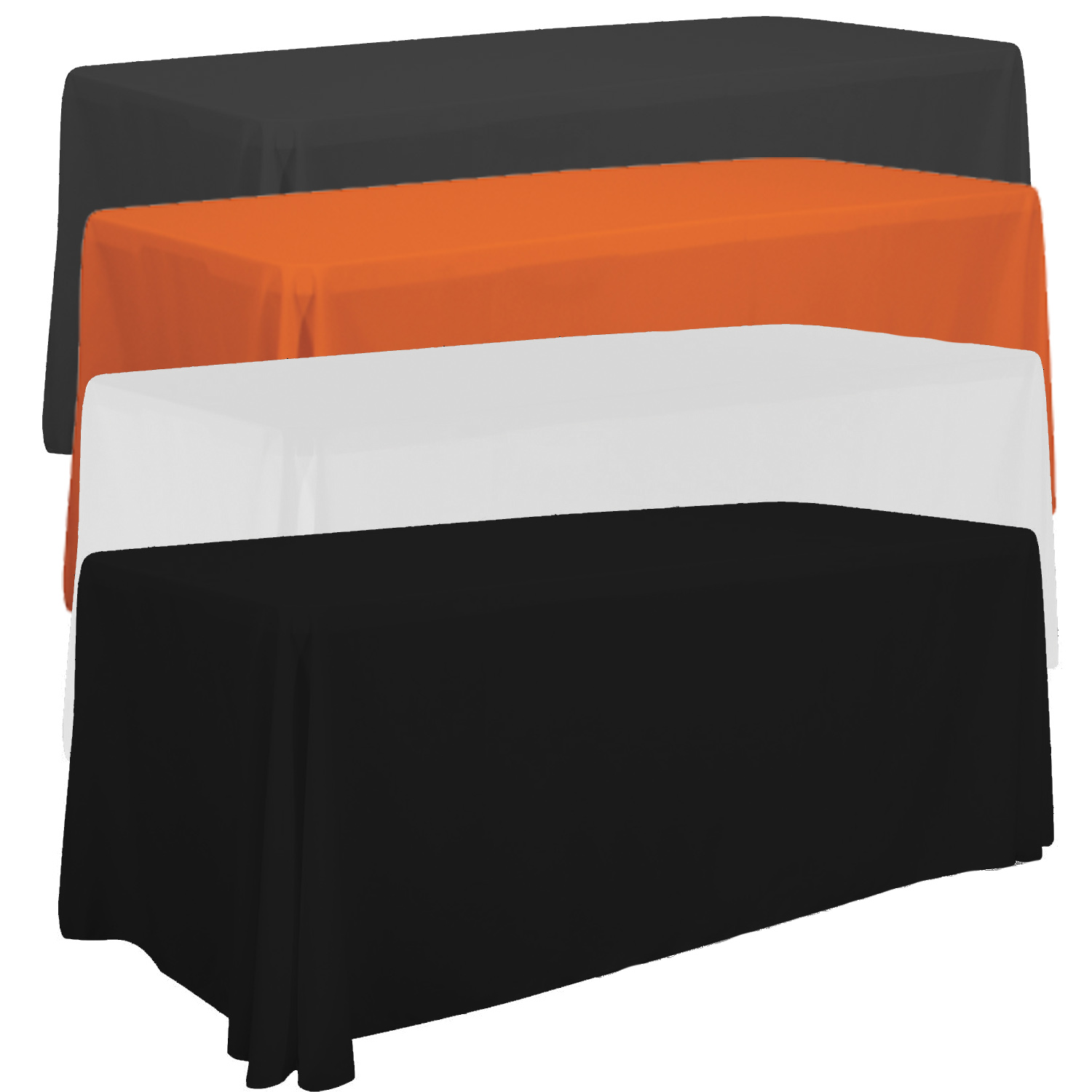 The open-back design of this throw gives you legroom and quick access to anything you store beneath the table. For use with tables 6' wide. Constructed of polyester poplin. Covers three sides of the table with a 9" overhang in back Draped corners. Product Size: 72" W x 28" H x 30" D. Product Weight: 2 lbs. Materials - Polyester Poplin. Primary Usage - Indoor.